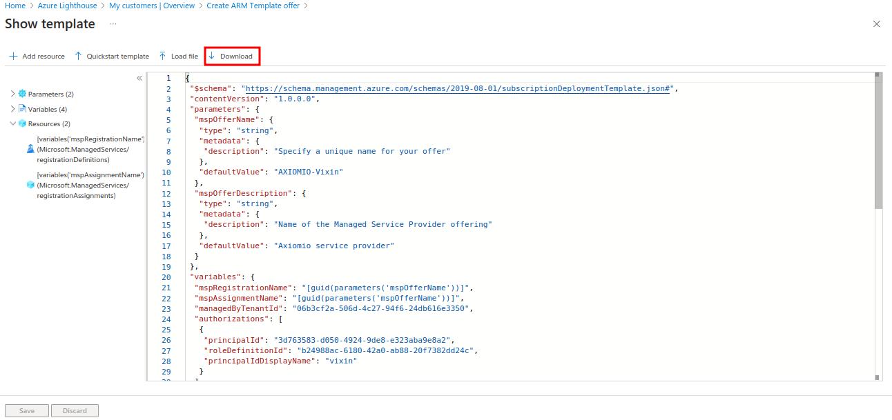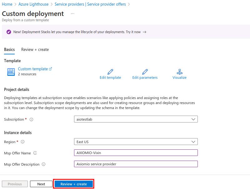 - Name and Description (These will be used for mspOfferName and mspOfferDescription in your template). The managedByTenantId is populated based