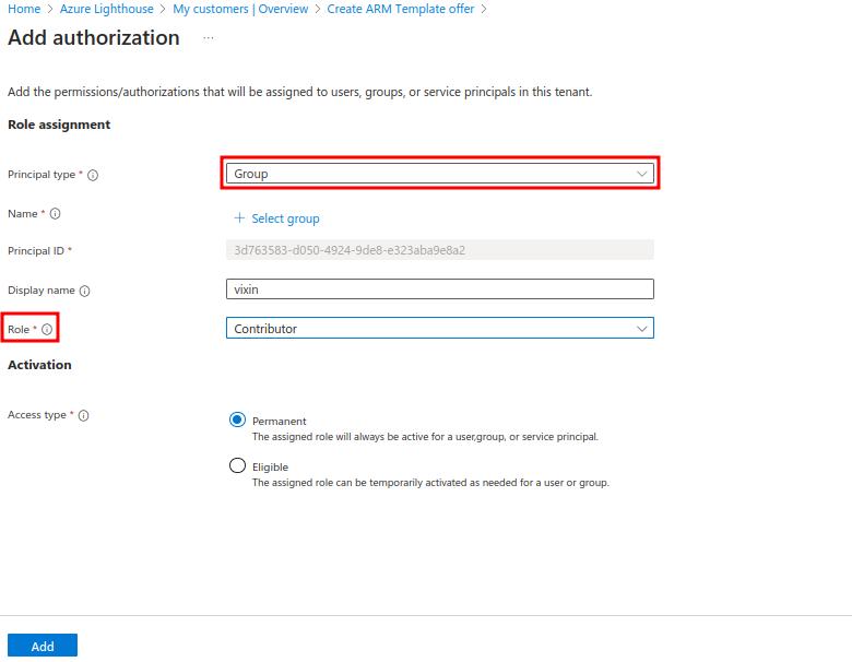 - Add authorizations by selecting + Add authorization. Provide the following details: