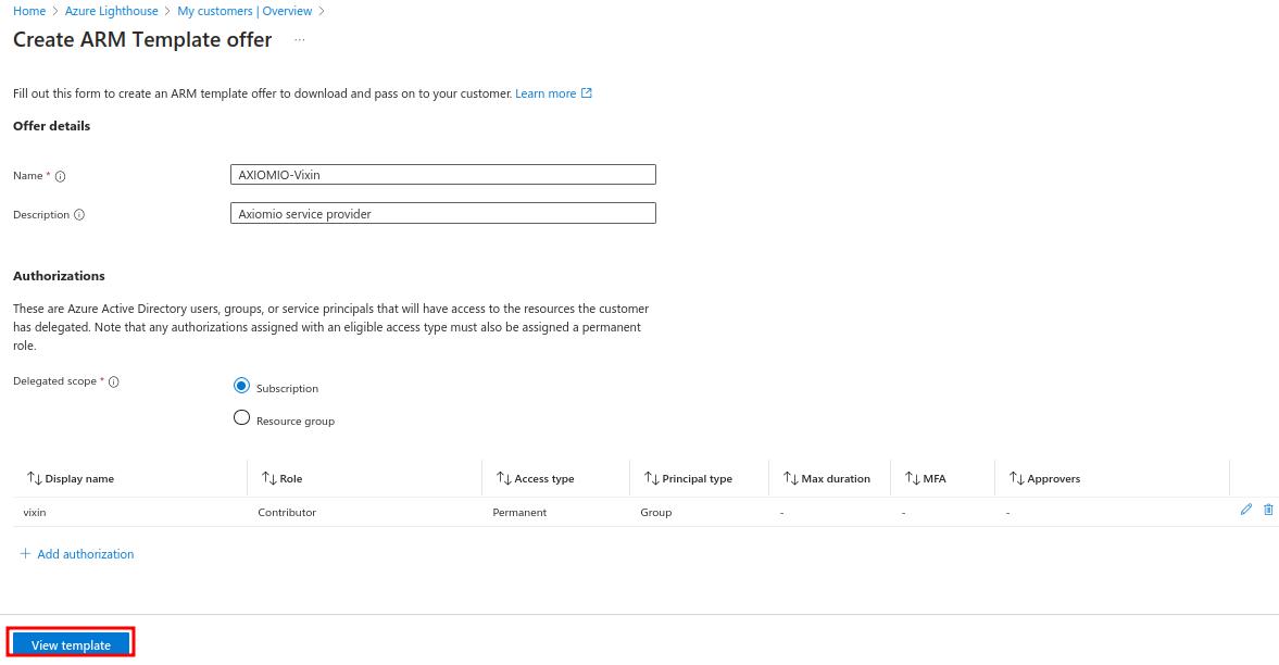 - In My customers page, Click on Create ARM Template offer.