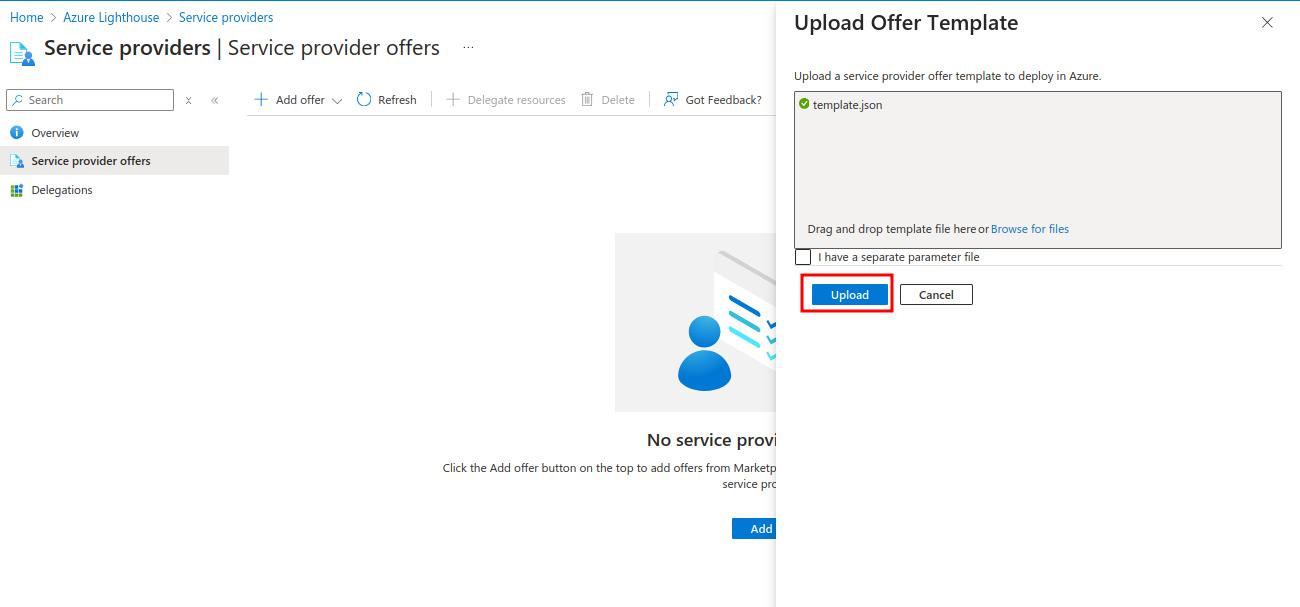 - Upload the ARM template(JSON file which we downloaded above) provided by the MSP.